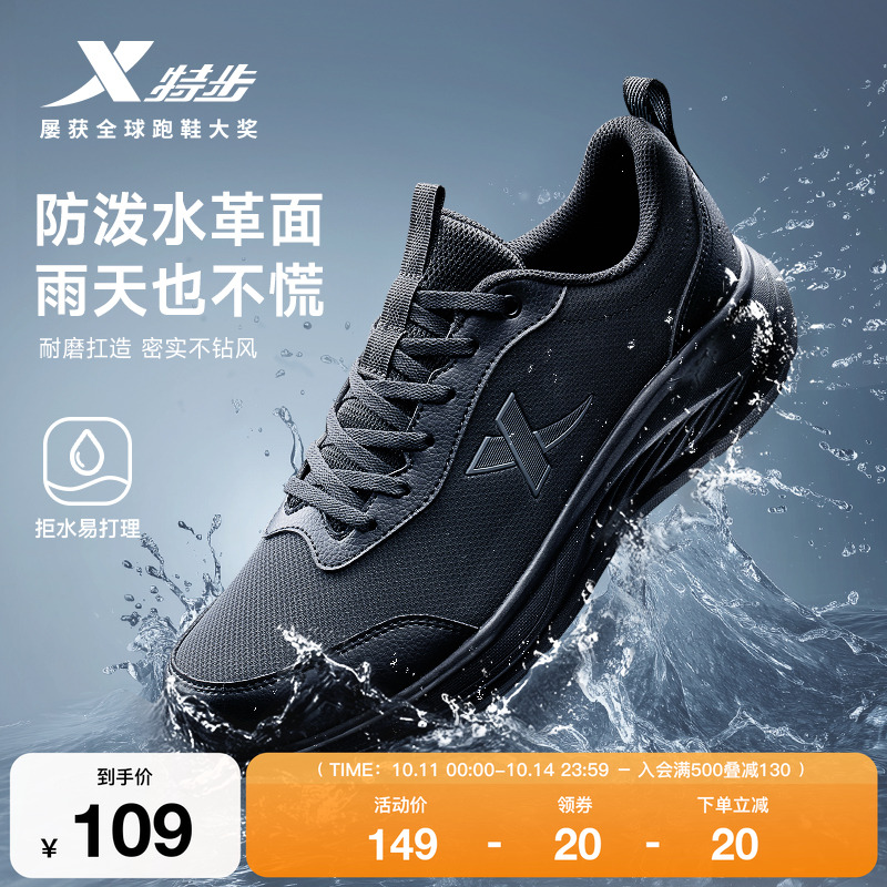 特步羽逸FW丨跑步鞋男黑色运动鞋秋冬新款皮面防泼水减震轻便跑鞋