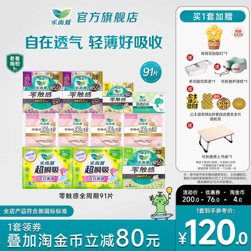 【赠品5选1】花王乐而雅零触感特薄透气日夜卫生巾姨妈巾91片