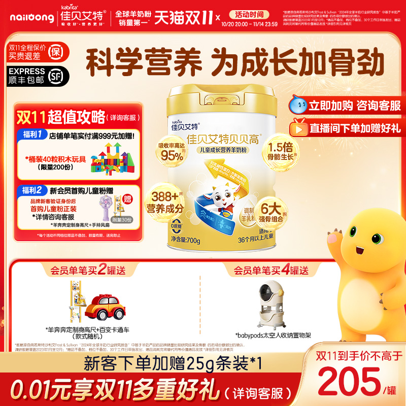 佳贝艾特旗舰店贝贝高儿童成长营养长高高羊奶粉 3岁以上700g CBP