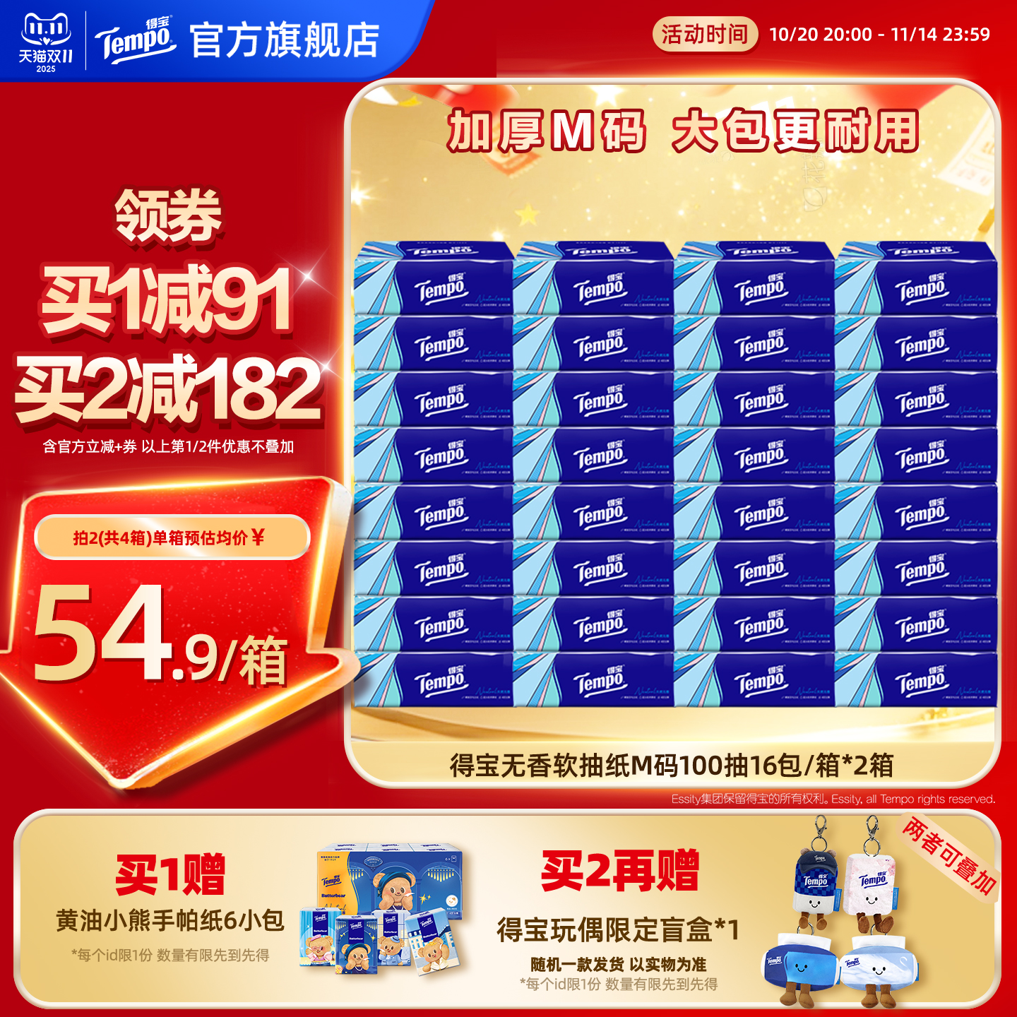 Tempo得宝抽纸4层加厚100抽16包/箱*2箱餐巾纸家用实惠装纸巾