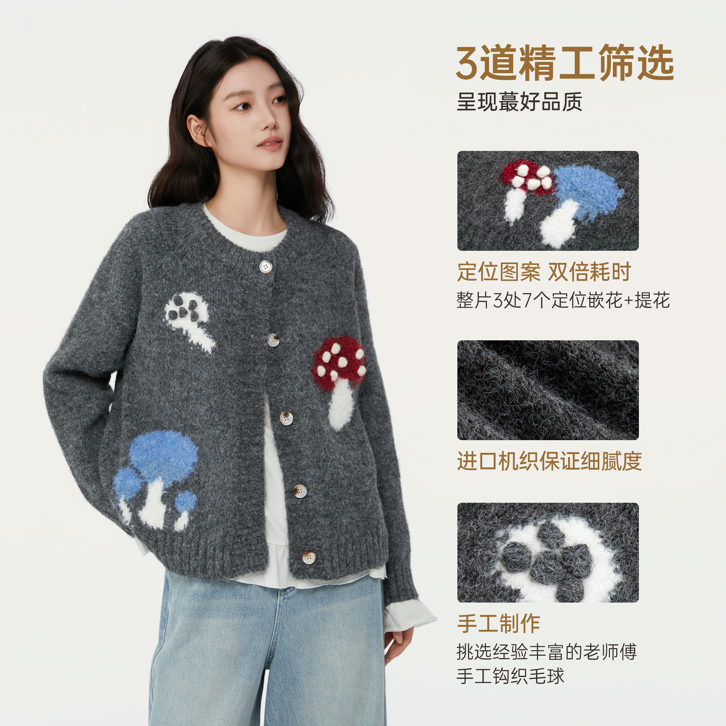 飞鸟和新酒刺绣时尚毛衣开衫女2025秋季新款灰色圆领休闲针织衫