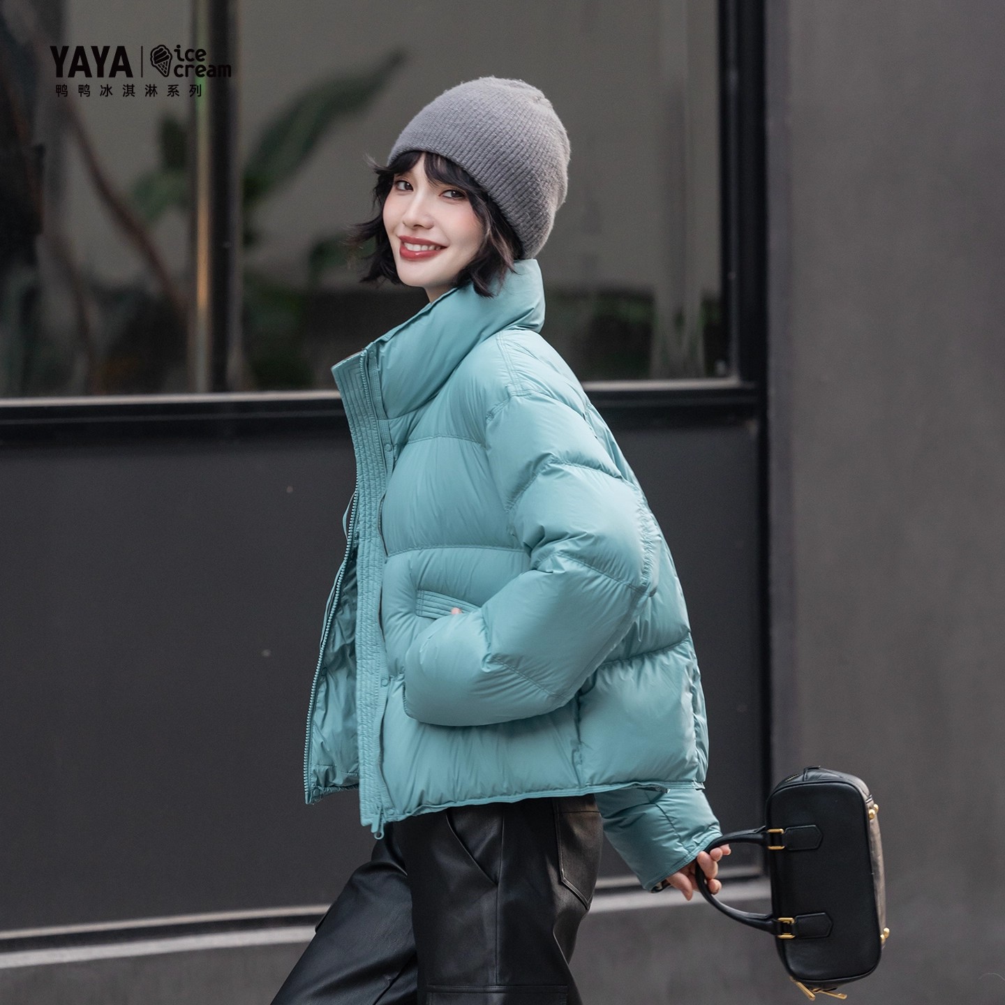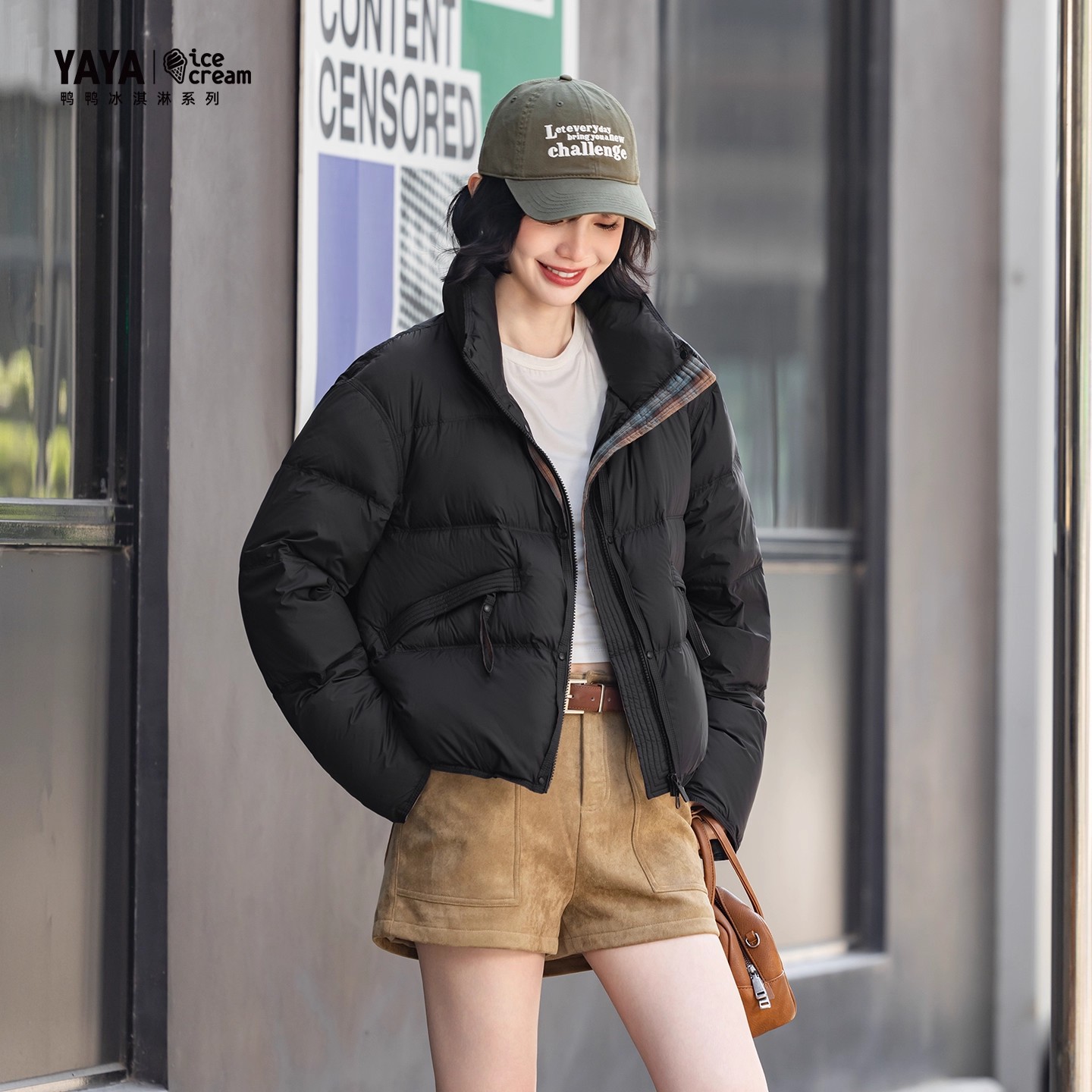 【冰淇淋系列】鸭鸭25冬女立领宽松厚款格子短款小个子外套羽绒服
