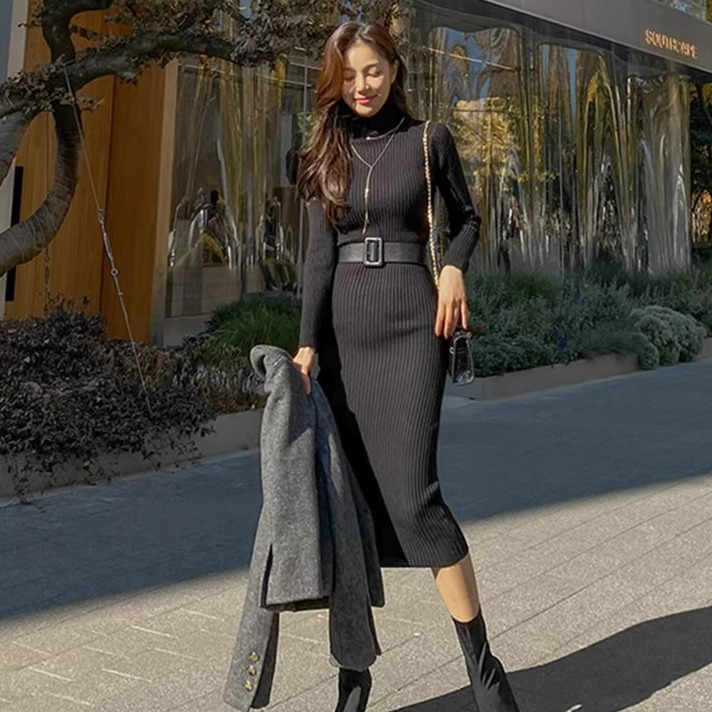 韩国东大门秋冬装新款女包臀中裙气质高领长袖系带收腰针织连衣裙